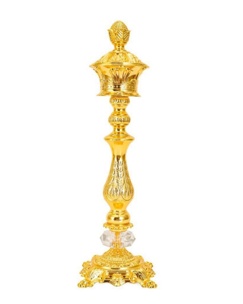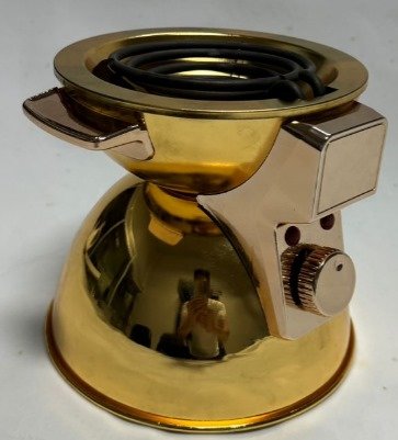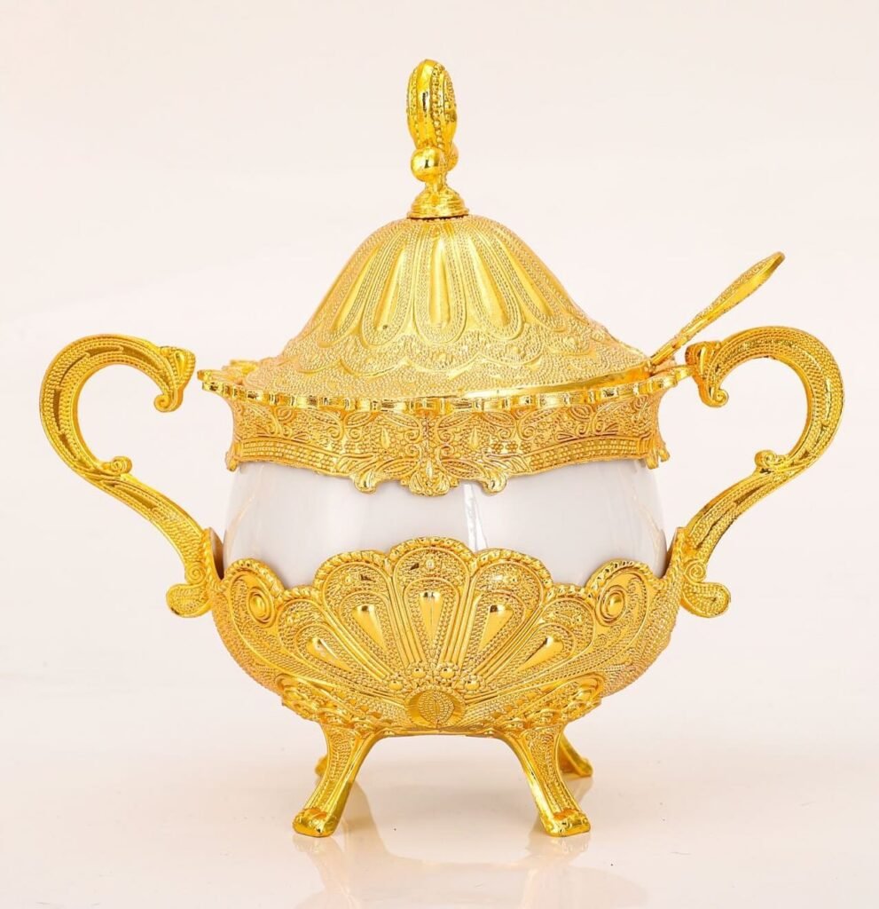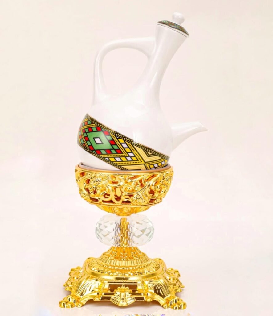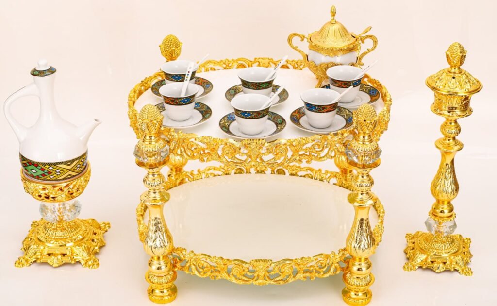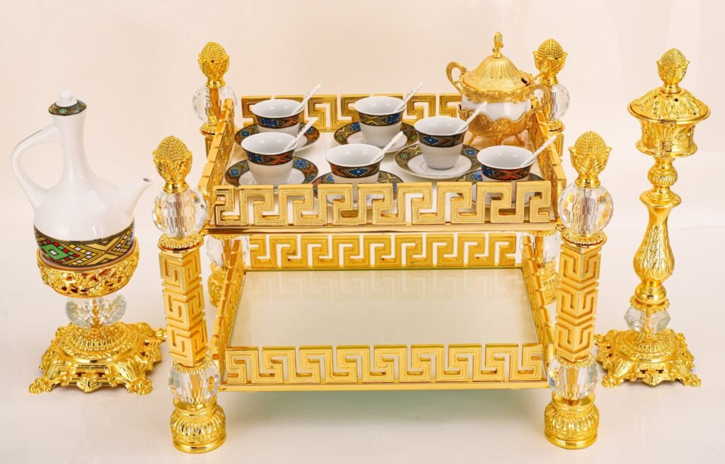 5 pieces in 1 set: (coffee table, incense burner, jebena rack, sugar cup & electric cooking plate). Color: golden.