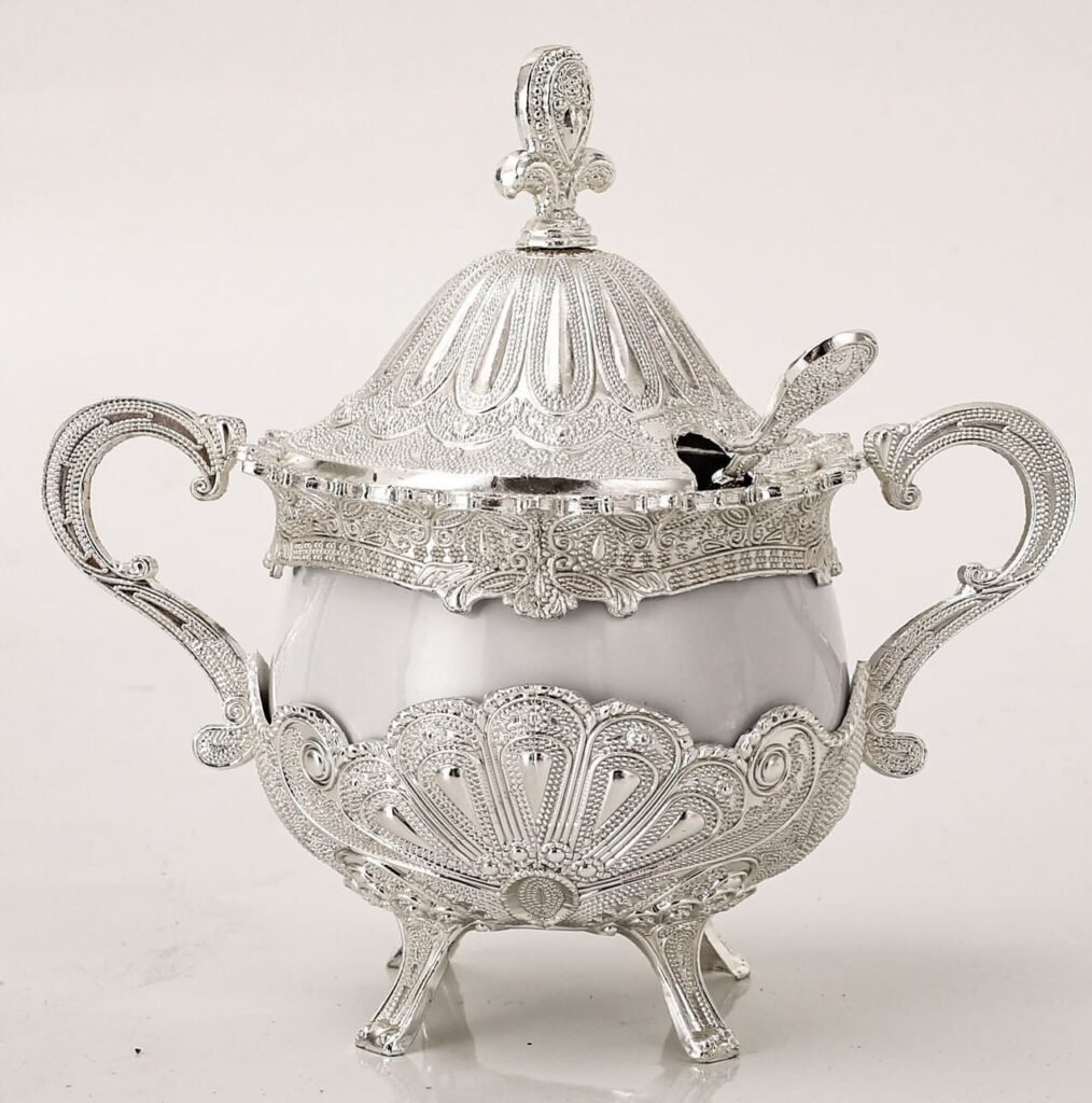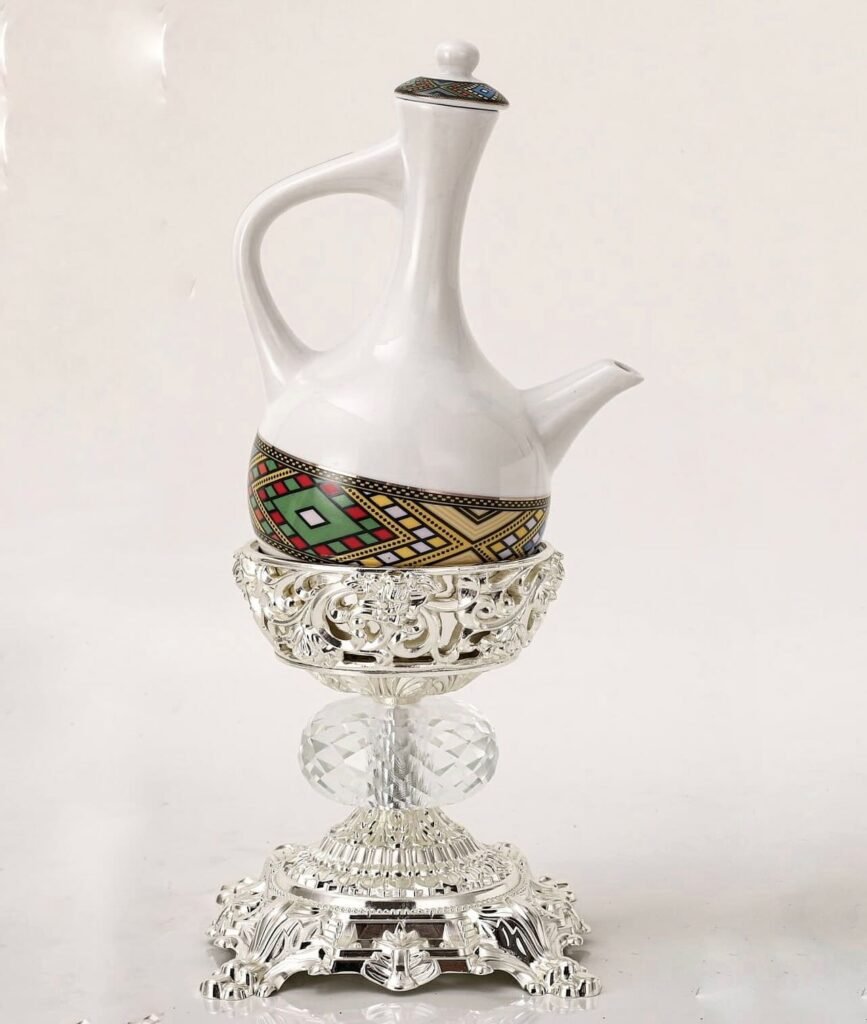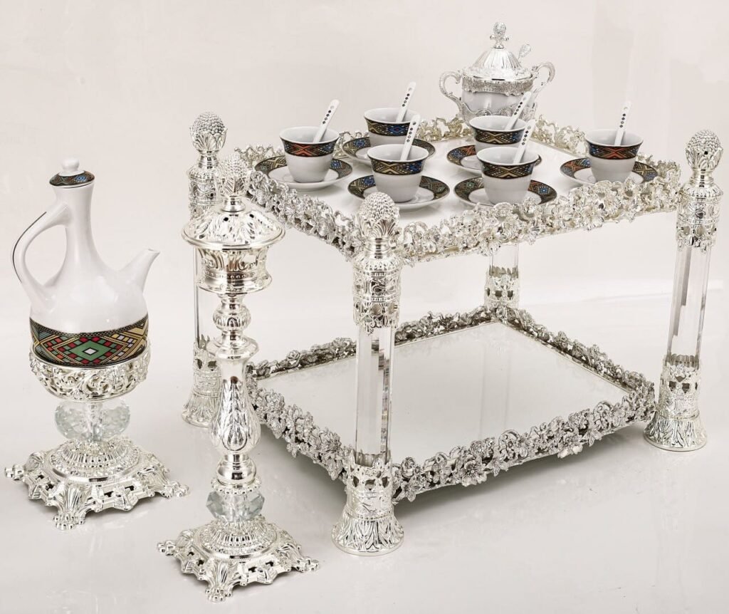 5 pieces in 1 set: (coffee table, incense burner, jebena rack, sugar cup & electric cooking plate). Color: silver.